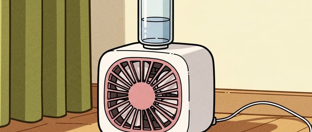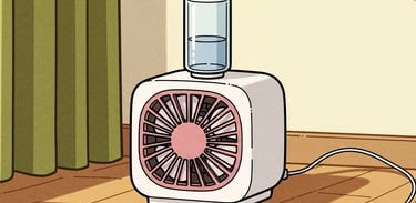 The fan is tiny and white with pink fenestrations. It is box-shaped with curved edges. At the top corners, it has cat-shaped protrusions. A transparent, cylindrical water gallon is fitted into the top, and a mist spray channel opens through its front fenestrations.